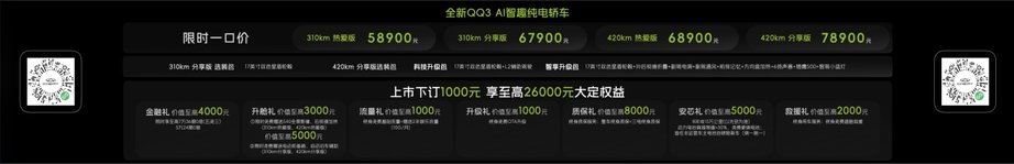 3月30日,“王者归来 一部到位”全新QQ3上市发布会在成都露天音乐公园盛大举行,一代“国民神车”在智电时代越级焕新,推出310km、420km两种续航版本共四款车型,官方上市价5.89万元起。此前车型已取得盲订订单超6万台、预售订单超4万台的傲人战绩。全新QQ3正式上市用“高颜值、大格局、强体魄、更懂你”的四大核心价值,诠释“一部到位”的快乐生活。