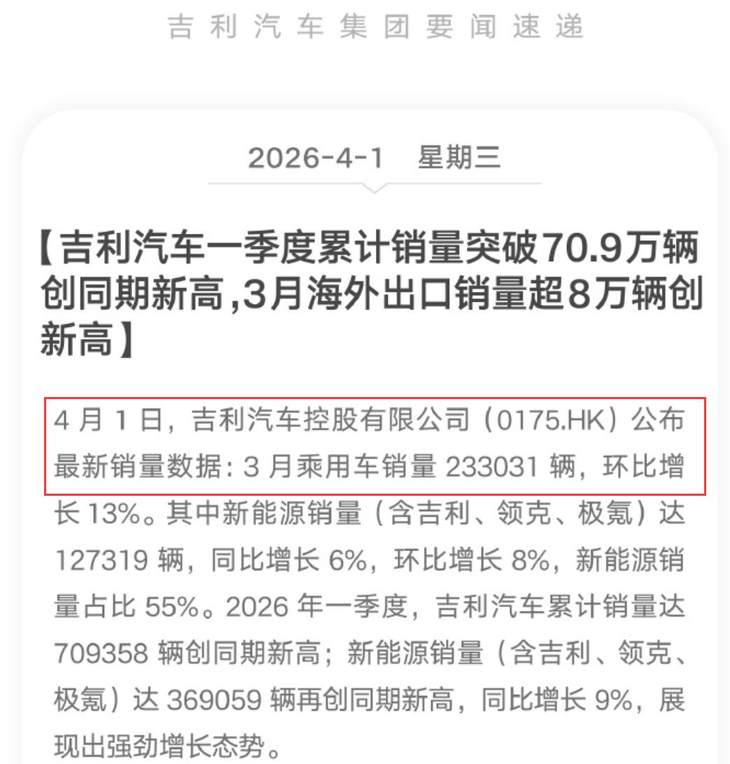吉利汽车:3 月销量为233031 辆