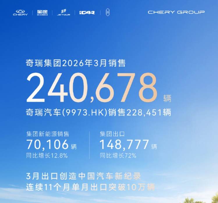 奇瑞汽车:3月销量达到240678辆