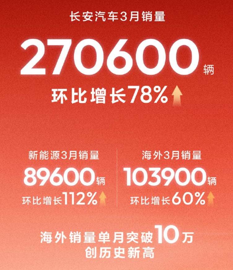 长安汽车3月销量达到270600辆,环比增长78%。其中,海外销量创历史新高,达到103900辆,环比增长60%,有点一路飙升的意思。此外,新能源销量达到89600辆,环比增长112%,长安汽车在新能源市场逐渐找到节奏感。
