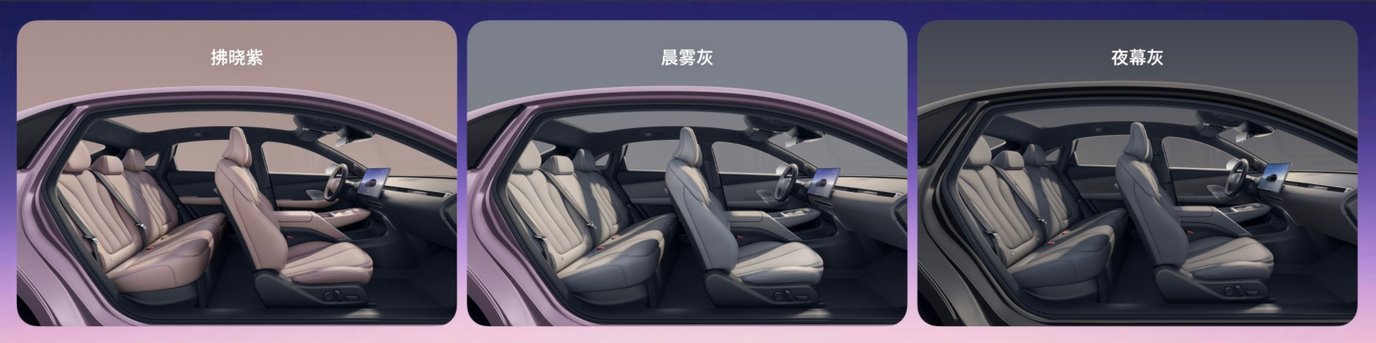 内饰延续拂晓紫、晨雾灰、夜幕灰三大色调,大面积软质包覆搭配顶棚与手机置物台仿麂皮材质,触感与精致感拉满。