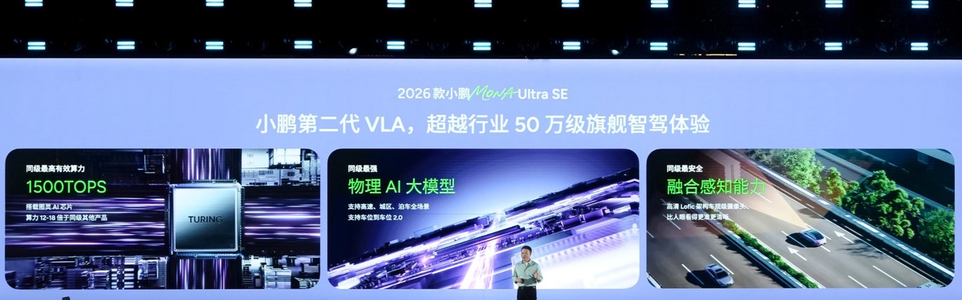 新车推出Max与Ultra SE双算力版本,Ultra SE版搭载双图灵芯片,有效算力高达1500TOPS,配备满血版小鹏第二代VLA,面向L4时代的物理世界模型,实现起点到终点全场景智驾覆盖,综合行车效率提升23%。