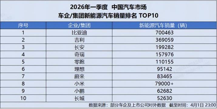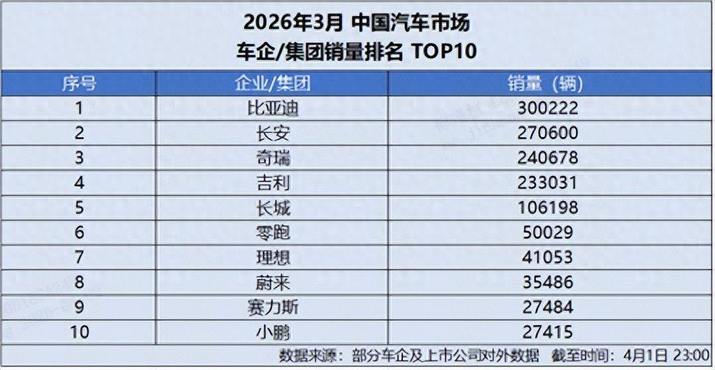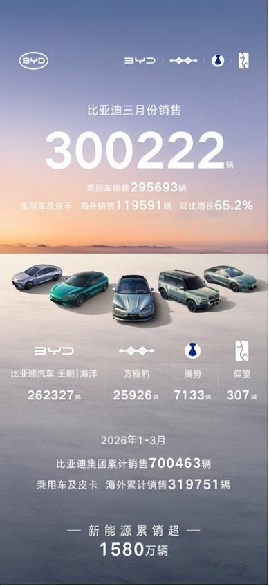 4月1日,比亚迪发布 2026 年 3 月产销数据,单月总销量达300222 辆,强势突破 30 万辆大关,再添荣耀战绩,斩获中国车企销量冠军,并连续 58 个月蝉联中国新能源汽车销量冠军,持续稳固行业龙头地位。截至目前,比亚迪新能源汽车累计销量已超1580 万辆,一季度累计销售 700463 辆,以硬核数据印证技术与规模双重实力。