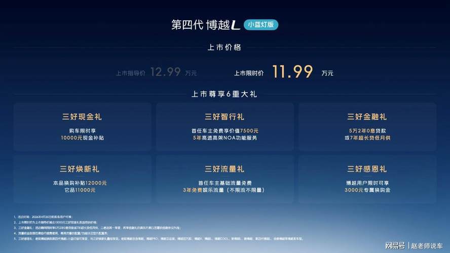 即日起至4月30日,用户购买第四代博越L小蓝灯版可限时享换购补贴12000元,博越用户换购还可叠加3000元专属换购金,此外还有7年超长贷等金融礼、流量礼、智行礼共计6重上市大礼。