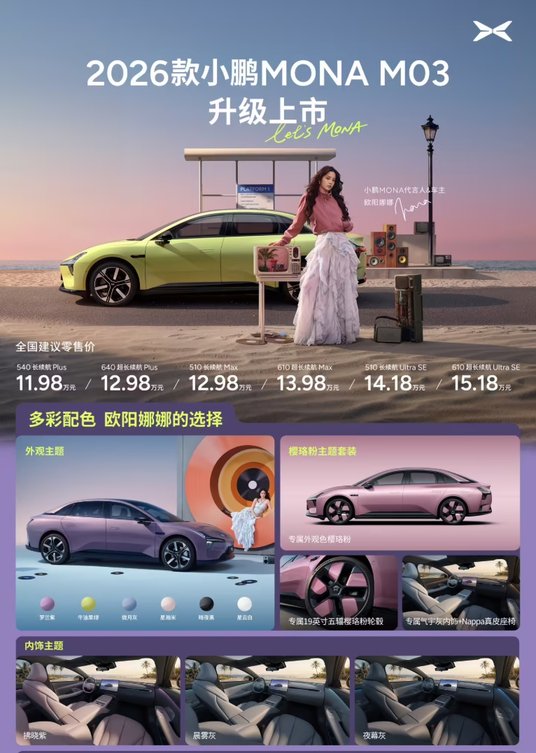 2026款小鹏MONA M03上市:最高算力750TOPS,11.98万-15.18万元