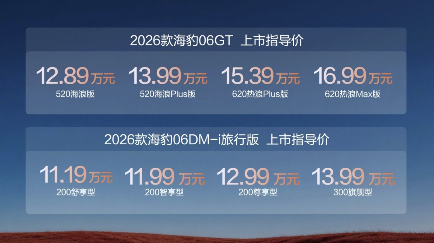 4月2日,汽车商评从官方了解到,比亚迪海洋网正式推出2026款海豹06GT与2026款海豹06DM-i旅行版。其中,2026款海豹06GT官方指导价为12.89-16.99万元,2026款海豹06DM-i旅行版官方指导价为11.19-13.99万元。