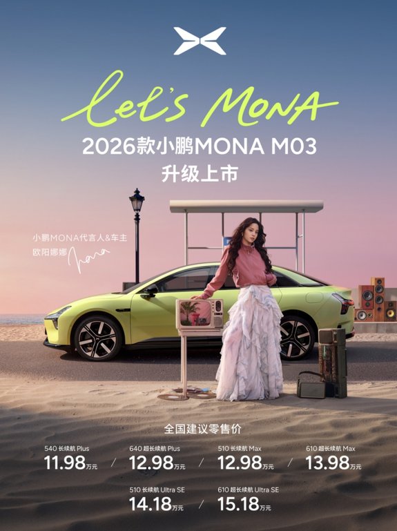 4月2日,2026款小鹏MONA M03升级上市。作为小鹏面向年轻用户打造的AI智能纯电轿跑,新车以“全方位对标20万级车型”为开发基准,在外观设计、智能科技、驾乘舒适与主被动安全等核心维度实现全面进化,致力于为年轻用户带来越级出众的用车体验。本次上市共推出6款版型,官方指导售价依次为:540长续航Plus 11.98万元、640超长续航Plus 12.98万元、510长续航Max 12.98万元、610超长续航Max 13.98万元、510长续航Ultra SE 14.18万元及610超长续航Ultra SE 15.18万元。品牌同步推出上市专属权益,即日起至2026年4月30日24点前下定2026款小鹏MONA M03,限时送至高价值超35,000元权益。