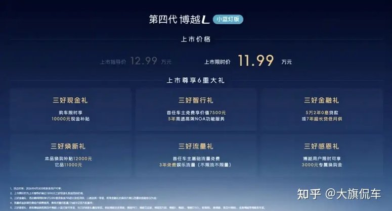 即日起至4月30日,用户购买第四代博越L小蓝灯版可限时享换购补贴12000元,博越用户换购还可叠加3000元专属换购金,此外还有7年超长贷等金融礼、流量礼、智行礼共计6重上市大礼。