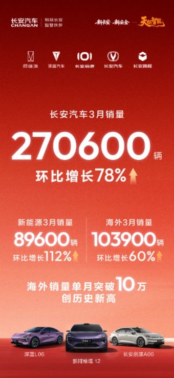4月1日,重庆长安汽车股份有限公司(以下简称“长安汽车”)公布了最新的销量成绩。数据显示,长安汽车3月销量达270600辆,环比增长78%;海外销量创历史新高,达103900辆,环比增长60%;新能源销量89600辆,环比增长112%。在汽车消费政策切换、去年底市场需求提前释放的背景下,长安汽车仍然保持稳健增长势头,彰显了新央企的增长韧性与发展质量。