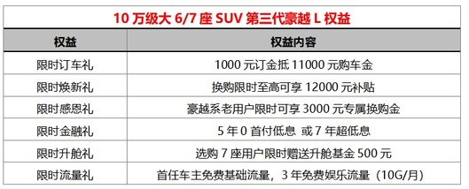 5年0首付或7年超低息!豪越L十万级中型SUV,大六七座触手可及
