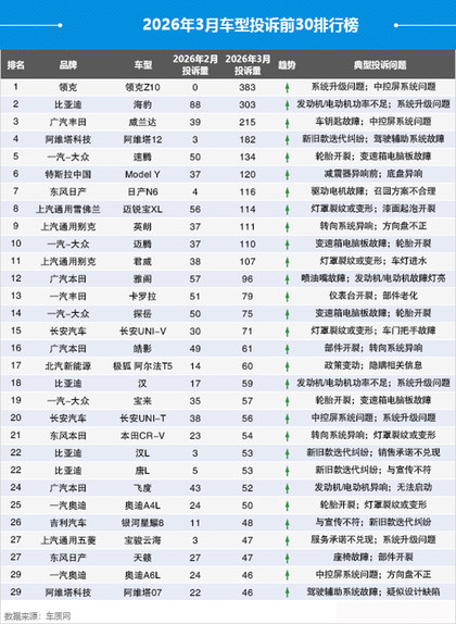 3月国内汽车投诉榜单(TOP30),合资品牌燃油车机械故障成重灾区