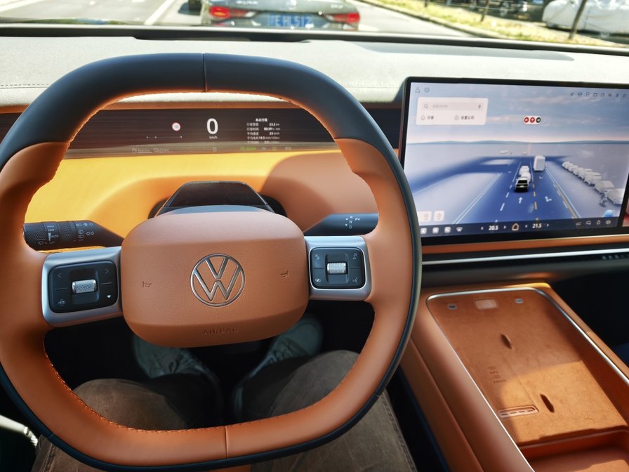 内饰总体上还是新能源车的传统风格,与以往的ID.系列是不可同日而语了,平铺直叙的大连屏,简洁的中控与门板设计,和外观一样无功无过,很容易让人适应与接受。配色方面,我觉得还是米色更耐看也更好用,橙内饰在晴天会带来比较明显的后视镜反光,个人不太推荐。