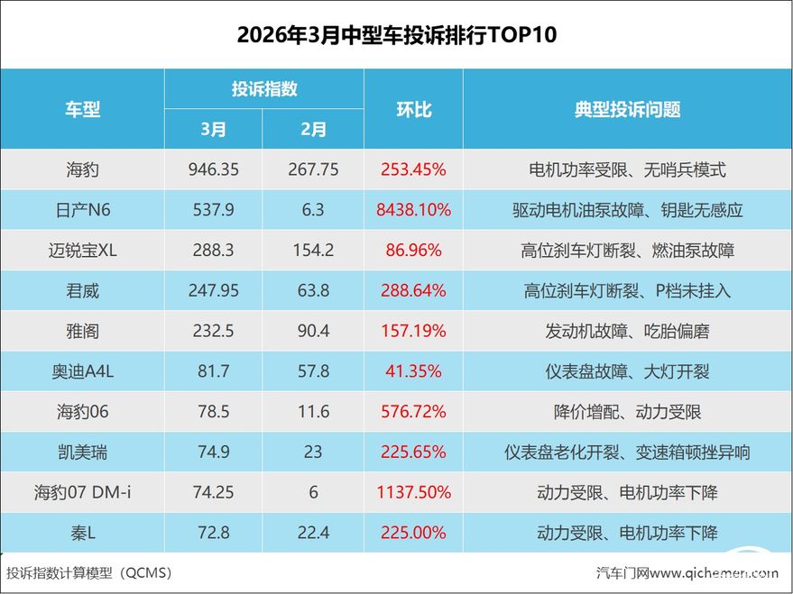 2026年3月中型车投诉指数排行:榜单车型均迎爆涨