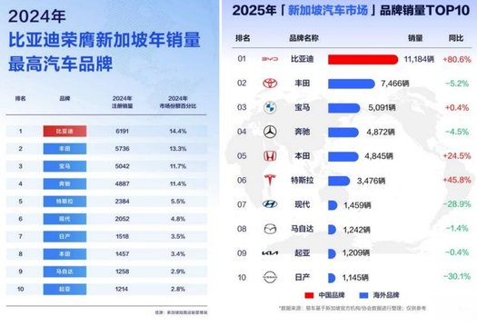 近期,据新加坡陆路交通管理局数据显示,2025年,比亚迪乘用车在新加坡销售11184辆,同比增长80.6%,蝉联年度全品牌销量冠军,用实力助力全球绿色出行。自2022年,比亚迪正式进入新加坡乘用车市场,仅用两年时间成功登顶榜首。
