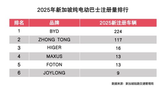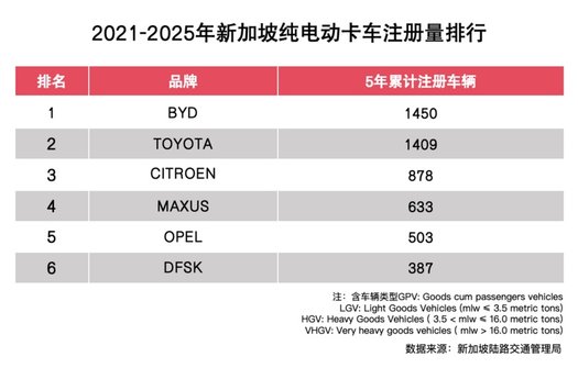 在电动卡车领域,比亚迪于2020年进入新加坡,开始向当地正式交付环卫车T9,成为当地第一家销售电动卡车的公司。2021年-2025年,比亚迪纯电卡车在新加坡五年累计注册量达1450台,排行第一。