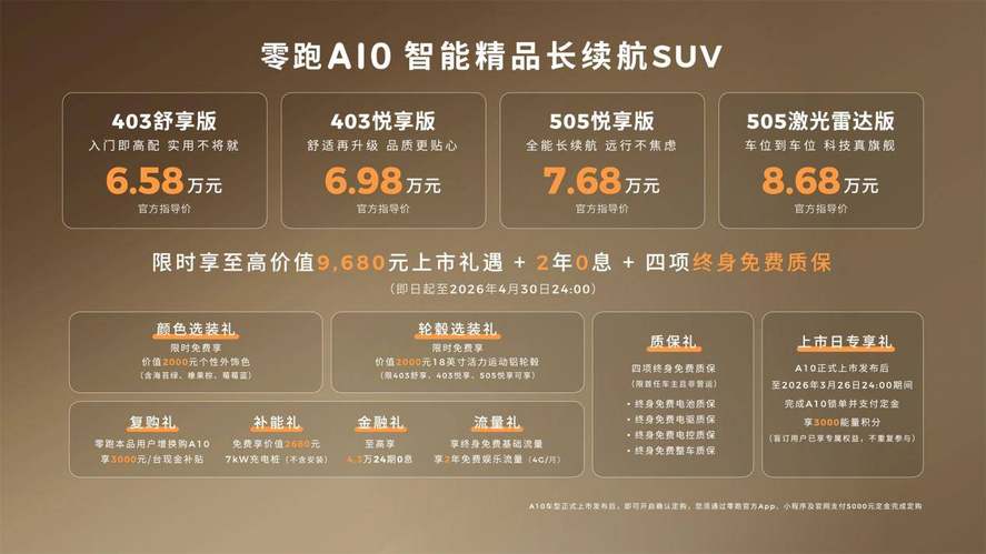 零跑A10的定价是6.58万-8.68万,这个价格,别说带激光雷达、高阶智驾的版本,就算是入门版,也给到了足够用的配置,真正做到了入门即高配,顶配不溢价。