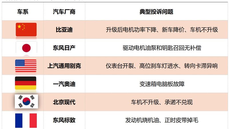 二、从投诉车企来看,TOP10中比亚迪出现新的集中投诉,多车因升级后电机功率下降引起车主不满。东风日产位列第二,驱动电机油泵与钥匙召回无补偿是主要槽点。上汽通用别克排名第三,仪表台开裂、高位刹车灯开裂、转向卡滞异响仍然是主要槽点。