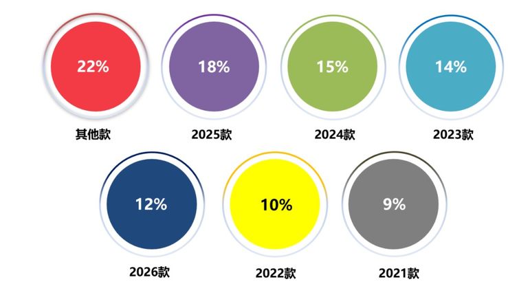 五、从车型年款来看,六年以上的老车、2025款、2024款是主要投诉源,投诉指数占比达到了54%。具体来看,六年以上的老车投诉占比第一,投诉点主要集中在英朗、迈锐宝XL、君威三款车型上。。2025款车型投诉占比18%,Model Y减震器异响和唐L闪充权益区别对待是被投诉最多的问题。海豹是2024款车型投诉的“重灾区”发动机功率不足引发集中投诉。