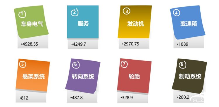 投诉指数:汽车门网全新构建汽车投诉指数计算模型(简称:QCMS),将车型质量投诉分为八大类,根据发动机、变速箱、车身及电气、制动系统、转向系统、悬挂系统、轮胎、服务等问题影响严重性分别赋权,并对集中性事件额外加权,最终形成有效投诉指数,指数越大越严重。