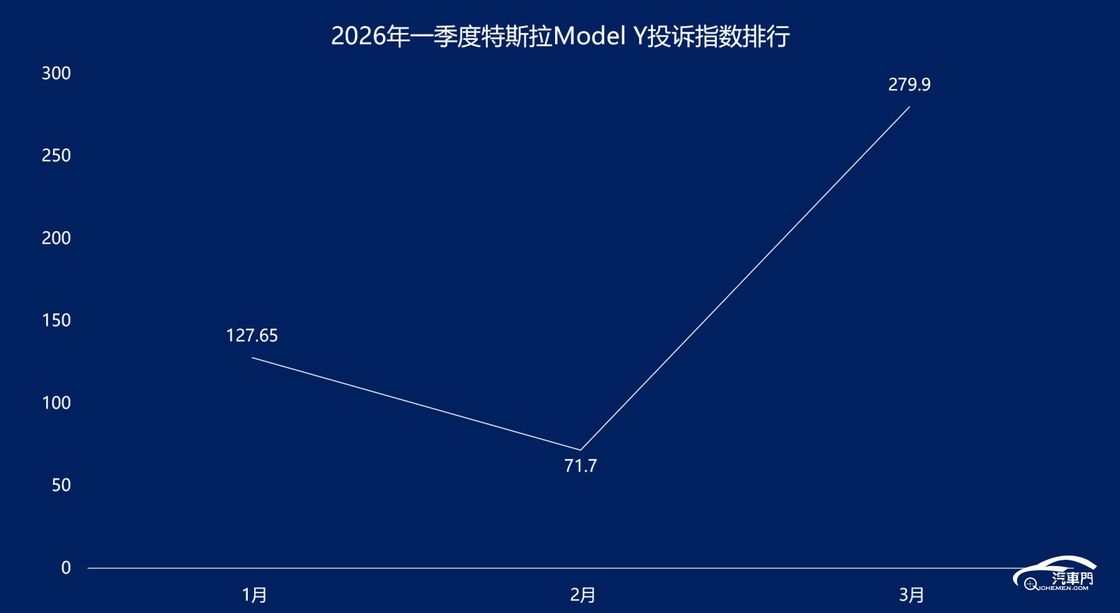 汽车门网数据显示:2026年3月,特斯拉Model Y的投诉指数达到了279.9,环比大幅上涨了290.38%,排名跃升至SUV投诉榜单第二。这背后,减震器异响成为车主集中投诉的原因,相关投诉指数高达195.5,占特斯拉Model Y整体投诉指数的70%。