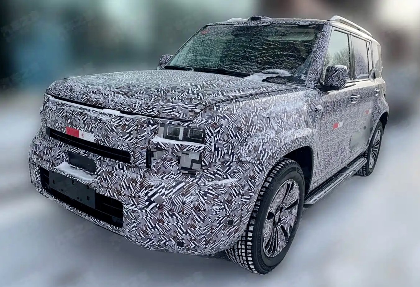 从伪装谍照来看,新车采用硬朗的方盒子车身设计,整体风格极具越野气质。前脸装配矩形大灯组,搭配半封闭式进气格栅,下部包围造型厚重;车顶搭载激光雷达,车身侧翼子板设有感知摄像头,预示其将搭载高阶智能驾驶辅助功能。
