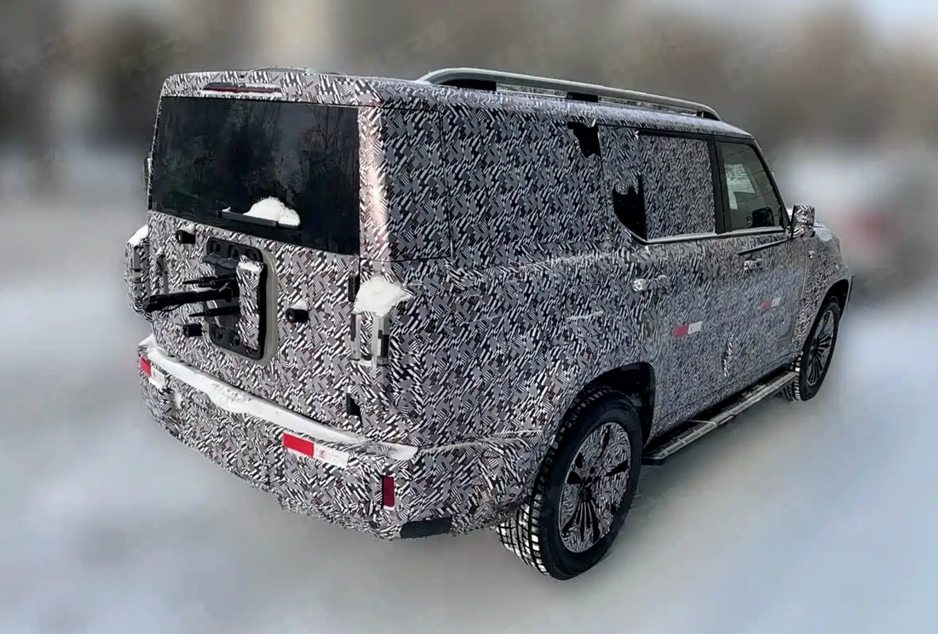 车身侧面配备固定式迎宾踏板与传统机械式车门把手,整车体态魁梧大气。据推测,车身长度将突破5米,宽度接近2米。车尾部分同样延续硬派设计,尾门中部预留外挂备胎安装位置,配合专属把手设计,可判断将采用侧开式尾门结构。
