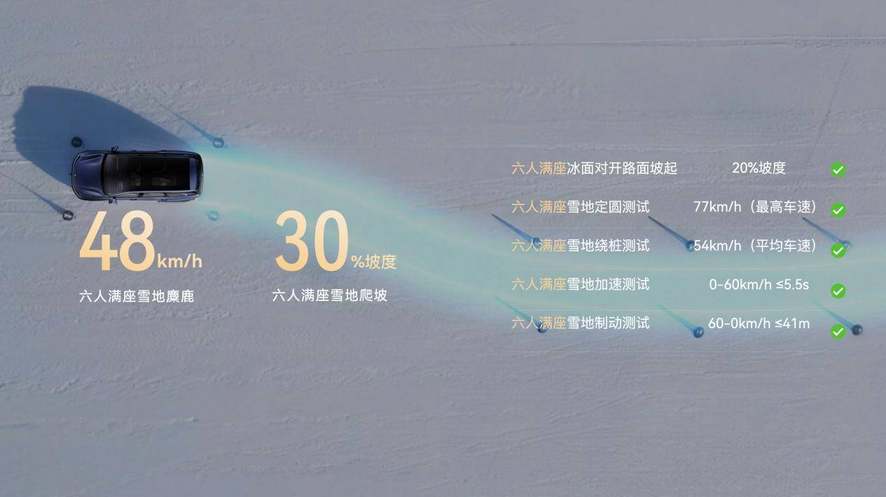 华境S以高效集成带来更高的出行品质和更低的用车成本。新车搭载灵犀动力3.0,匹配智能适时四驱系统,综合功率386kW、峰值扭矩620N·m,百公里加速5秒级;四驱版馈电油耗6.98L/100km,两驱版低至5.98L/100km,满油满电续航超1100km,大幅降低用车成本。同时,在雪地麋鹿测试中,华境S以六座满员状态跑出48km/h优异成绩,展现出强大的冰雪路面操控稳定性,全场景出行都从容。