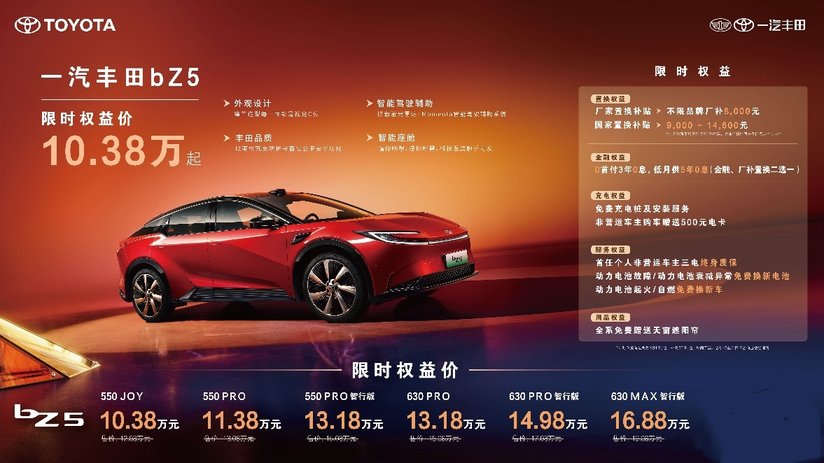 纯电车型bZ5在4月推出限时权益加码,置换权益升级为不限品牌厂补8000元,更可叠加9000-14600元的国家置换补贴,550JOY车型叠加厂补及国补后,限时权益价低至10.38万元。金融权益也是诚意满满,0首付3年0息,低月供5年0息,降低购车门槛(置换、金融二选一)。同时匹配免费充电桩、500元电卡、非营运车主三电终身质保及电池三兜底保障政策,为后续用车提供安心保障。4月购车用户还可免费获赠天窗遮阳帘,舒适加倍。