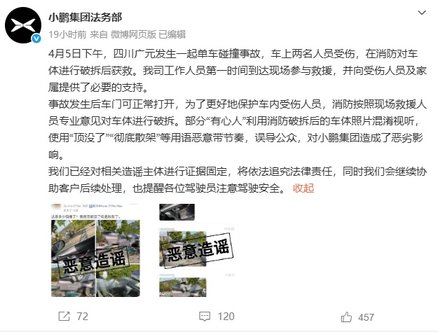 小鹏指出,部分“有心人”利用消防破拆后的车体照片混淆视听,使用“顶没了”“彻底散架”等用语,恶意带节奏误导公众,法务部将对造谣主体追究法律责任。