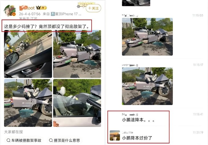 有人配上耸人听闻的文字:“这是多少码撞的?顶都没了,彻底散架!”还有人将矛头直指“小鹏降本”,暗示车辆结构强度不够。