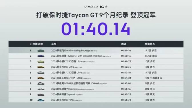 赛道性能与充电性能并重。 领克10+不仅充电快,跑得也快——最高功率680kW双电机四驱,零百加速仅3.2秒,80-120km/h中段加速2.1秒。电驱系统应用航天级镁合金技术,整机净重仅75kg,CLTC工况效率达93.7%。山路圈速1分40秒14超越保时捷Taycan GT,登顶亚洲山脊赛道圈速榜榜首。在“充电速度”之外,领克10系列正试图证明:纯电运动轿车,同样可以兼顾性能与效率。