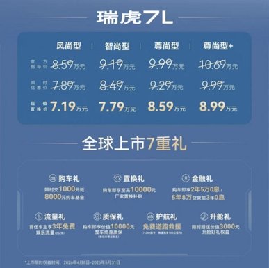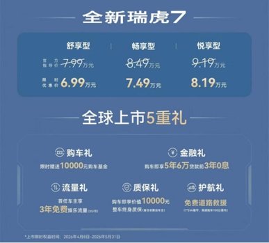 瑞虎 7L 官方指导价 8.59-10.69 万元,限时优惠价 7.89-9.99 万元,还可享超值置换价7.19-8.99万;全新瑞虎 7 官方指导价 7.99-9.19万,限时优惠价 6.99 万 - 8.19 万,瑞虎 5 运动版官方指导价 7.99-8.99 万元,限时优惠价 7.09-8.09 万元,置换后低至 6.79 万起,用全球统一的品质标准,打破了 “入门级车型就得将就” 的行业固有印象。更以整车+发动机终身质保构建行业领先服务体系,将长期品质承诺落到实处,让全球车品质真正走进普通家庭。