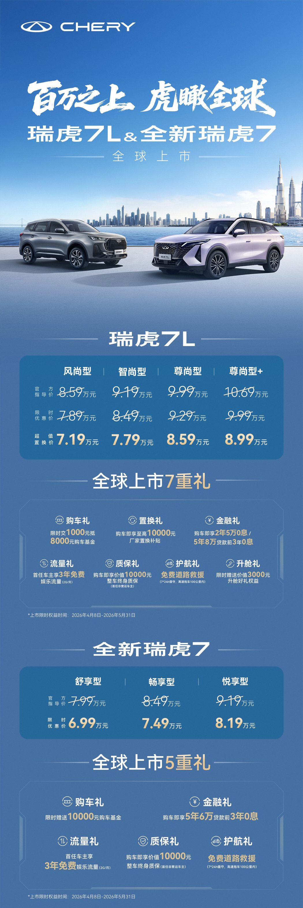 瑞虎7L推出1.5T、1.6T两种动力版本,有风尚型、智尚型、尊尚型、尊尚型⁺四个版型,官方指导价8.59-10.69万元,限时优惠价7.89-9.99万元,超值置换价7.19-8.99万元;全新瑞虎7推出舒享型、畅享型、悦享型3个版型,官方指导价7.99-9.19万元,限时优惠价6.99-8.19万元;瑞虎5运动版推出潮动版、潮酷版、潮玩版3个版型,官方指导价7.99-8.99万元,限时优惠价7.09-8.09万,超值置换价6.79-7.79万元。