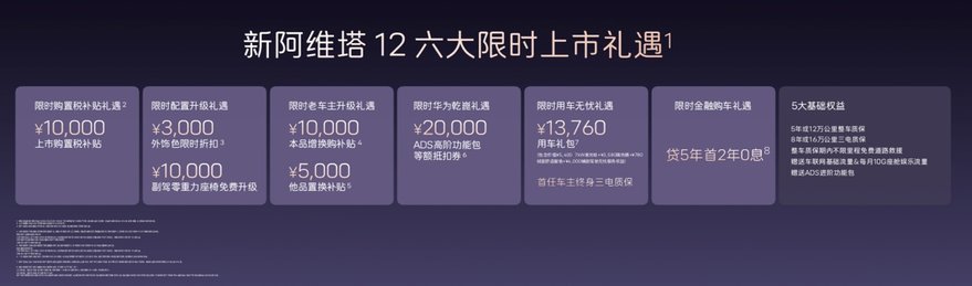新阿维塔12定位未来智能豪华轿车,面向时代精英人群,主打豪华、智能、旗舰级出行体验。新车全系标配12项顶格配置,涵盖华为乾崑智驾全系统、太行智控2.0、35.4英寸4K全景星环屏、25扬英国之宝音响、全车9安全气囊等,百万豪车顶配选装功能悉数标配。同时推出六大限时购车礼遇,购置税补贴礼遇、配置升级礼遇、老车主升级礼遇、ADS高阶包抵扣权益、贷5年首2年0息金融礼遇、万元用车无忧礼遇,入门即满配,彻底打破豪华门槛。