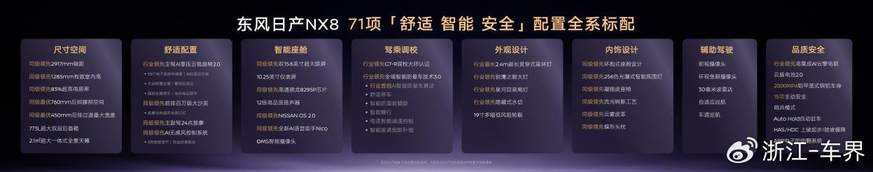 发布会上,东风日产宣布NX8全系标配71项高价值配置,在舒适、智能、安全三大维度,实现合资首个“入门即满配”。