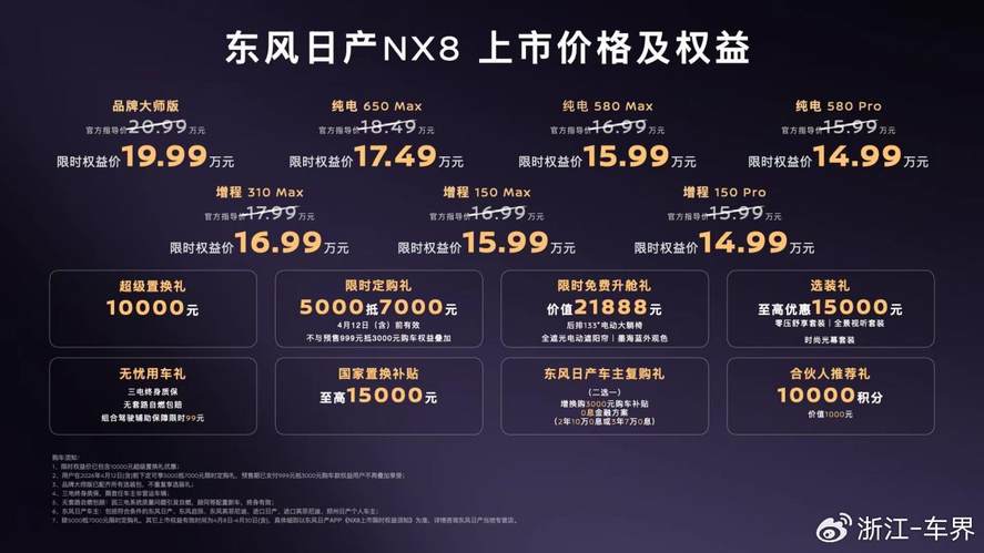 上市权益八重礼同步公布,包括超级置换礼:4月30日前下订直减10000元,叠加优惠后,东风日产NX8上市限时权益价为14.99-17.49万元;限时定购礼:4月12日前支付5000元定金可抵7000元;限时免费升舱礼:免费赠送后排133°电动大躺椅、全遮光电动遮阳帘、墨海蓝外观色;选装礼:零压舒享套装、全景视听套装、时尚光幕套装,限时超低价;以及无忧用车礼、国家置换补贴、东风日产车主复购礼、合伙人推荐礼等。
