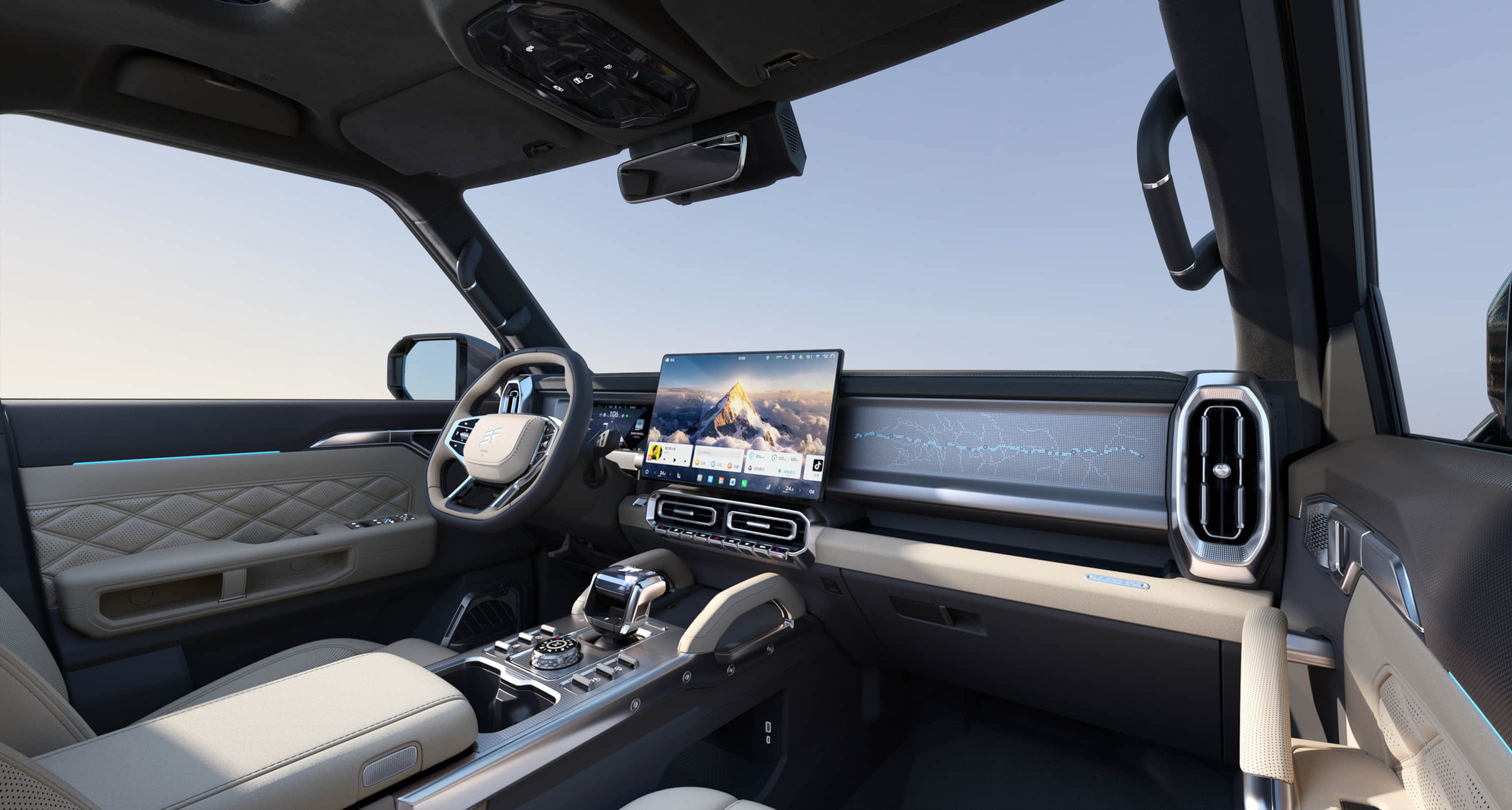 细节上,二排小桌板、64英寸全景天窗、10层结构的舒云座椅,还有中汽研认证的5星健康座舱。毕竟大多数买方盒子的用户,不是天天去豁车,更多是城市通勤为主,周末兼顾户外出行,车辆的舒适性、实用性,和越野能力同样重要。