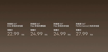 新阿维塔 12 作为华为乾崑深度赋能的旗舰轿车,以纯电与增程双动力布局推出 7 款车型,售价区间 29.39 万 —43.39 万元,搭配多重购车权益,直接瞄准中高端智能轿车核心市场。与此同时,定位 “智美全场景运动轿车” 的阿维塔 06T 开启预售,4 款车型预售价 22.99 万 —27.99 万元,以更亲民的门槛切入主流市场。双车形成高低搭配、互补协同的产品矩阵,覆盖 23 万 —44 万元核心价格带,全面满足家用、商务、运动等多元需求。