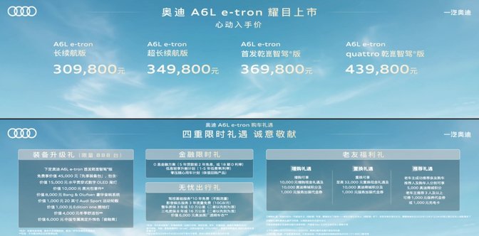 从产品定价来看,奥迪A6L e-tron 售价30.98万-43.98万,Q6L e-tron 限时售价 26.98 万 - 39.98万,Q6L Sportback e-tron限时售价28.98万-41.98万,以十足诚意拉低豪华纯电旗舰入手门槛。