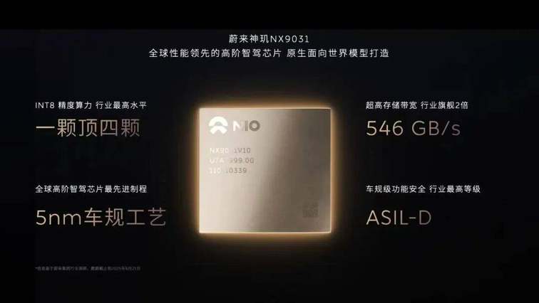 最后,再简单说一下“全球首颗5nm车规级工艺高阶智能辅助驾驶芯片”——「神玑 NX9031」。按照蔚来的说法,该芯片每秒可运行超6万亿条指令,其546GB/s的存储带宽两倍于行业旗舰芯片,算力达“行业最高水平”,可满足5年以上智能辅助驾驶的演进需求。