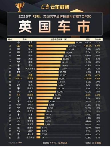 在欧洲市场,奇瑞迎来爆发式增长。3 月奇瑞以 22495 辆斩获英国汽车品牌销量第 2 名,同比暴涨 481.6%,市占率 5.9%,超越宝马、福特等老牌车企;1-3 月英国累计销量 36038 辆,同比增长 460.6%,增速断层领先。目前奇瑞已进入欧洲 18 国市场,今年 1-2 月英国及欧盟市场销量 39135 辆,同比大涨 200%。