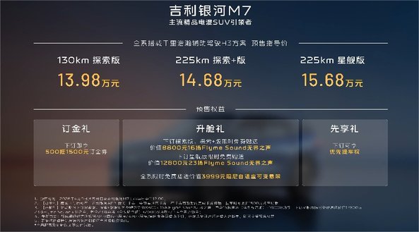 吉利银河M7本次预售共有订金礼、升舱礼、先享礼三重豪礼相送。预售期间下订用户不仅可享500元抵1500元订金券与优先提车权,全系产品限时免费赠送价值3999元阻尼自适应可变悬架。预售期间,下订130km探索版、225km探索+版的用户,限时免费赠送价值8800元 16扬Flyme Sound无界之声;下订225km星舰版的用户,限时免费赠送价值12800元23扬Flyme Sound无界之声。