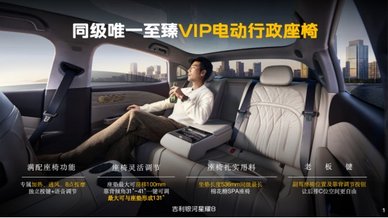 新车搭载同级唯一的至臻VIP电动行政座椅,座垫长度达到同级最长的536mm,配合100mm超长滑动距离与131°最大靠背调节角度,无论何种身材都能找到最舒适的坐姿。同时,座椅集成了专属加热、通风及8点按摩功能,搭配后排独立控制面板与副驾“老板按键”,让后排乘客轻松享受百万级行政座驾的尊崇体验。前排座椅同样满配,同级唯一的躺平副驾,支持最大180°放平,可与后排座椅坐垫纯平连接,形成前后一体式豪华按摩沙发床,开启16点全身热石按摩,搭配后排隐私玻璃,让用户在旅途中随时享受“商务头等舱”般的惬意时光。