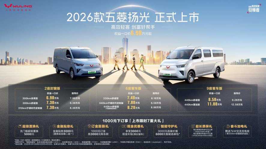 “高效轻客,创富好帮手”。4月13日,2026款五菱扬光通过一场高效创富场景挑战直播正式上市,限时一口价6.98万起!作为新能源轻客标杆车型,五菱扬光已连续24个月蝉联细分市场销冠,本次升级精准聚焦城配司机提升创富效率的核心需求,全新搭载基于五菱“天·灵·神”技术体系打造的三大商用车专用技术,在维持原售价的基础上,实现“续航加码”、“动力加码”、“智能加码”、“空间大码”的全方位升级。以“只加码,不加价”的诚意助力司机开启高效创富新一程;更用硬核技术定义高效轻客新标准,持续引领行业良性发展。