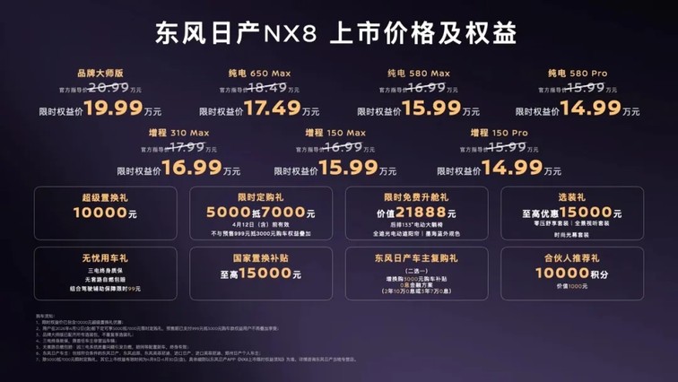 诚意破局,为爱同行。东风日产NX8以14.99万起的亲民价格、全系满配的硬核实力、坦诚务实的品牌态度,为中国家庭带来更安心、更舒适、更省心的出行体验,也为合资品牌新能源转型树立了全新标杆。目前,纯电车型已正式交付,增程车型将于5月中下旬陆续交付,静待每一个家庭开启幸福出行新旅程。
