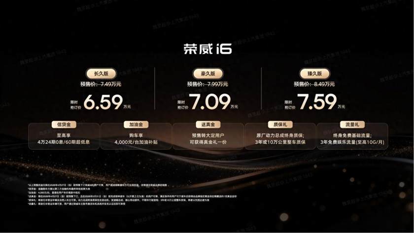 预售期间,荣威i6推出多重诚意政策:至高4万元24期0息/60期超低息、4000元/台加油补贴;5月底前预售转大定并提车,可获赠足金金钞,降低购车门槛与用车成本。