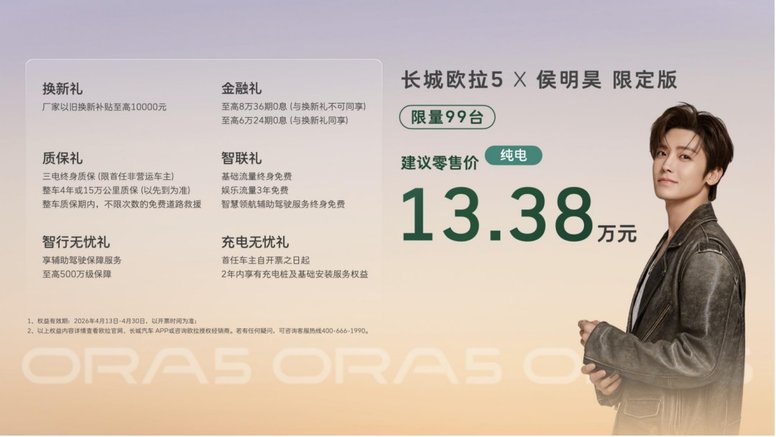 4月13日,长城欧拉携手品牌代言人侯明昊及粉丝团队打造的共创产品——欧拉5限定版纯电版正式上市,建议零售价13.38万元。与欧拉5580km激光雷达版同价却实现“加量不加价”,新增敦煌绿车漆、专属尾标、中央扶手箱刺绣等多项专属配置,还可享受“换新礼”“金融礼”等多重限时好礼。