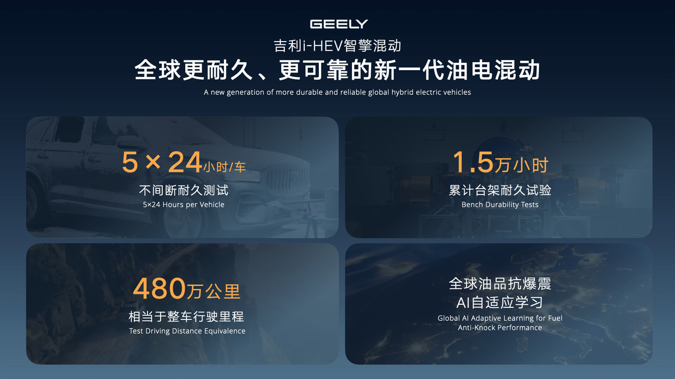 多年来,吉利始终以严苛标准坚守产品可靠性,为全球用户打造更耐久、更可靠的高价值产品,这一理念也同样贯穿i-HEV智擎混动技术的开发全过程。依托全球最极限验证体系,吉利对i-HEV智擎混动累计开展了1.5万小时的台架耐久试验,相当于整车行驶里程约480万公里,比传统混动标准高出20%以上;还通过AI自学习方式,让发动机自适应全球不同油品的抗爆性指标,确保i-HEV智擎混动产品在全球任一地区都能安全高效行驶。