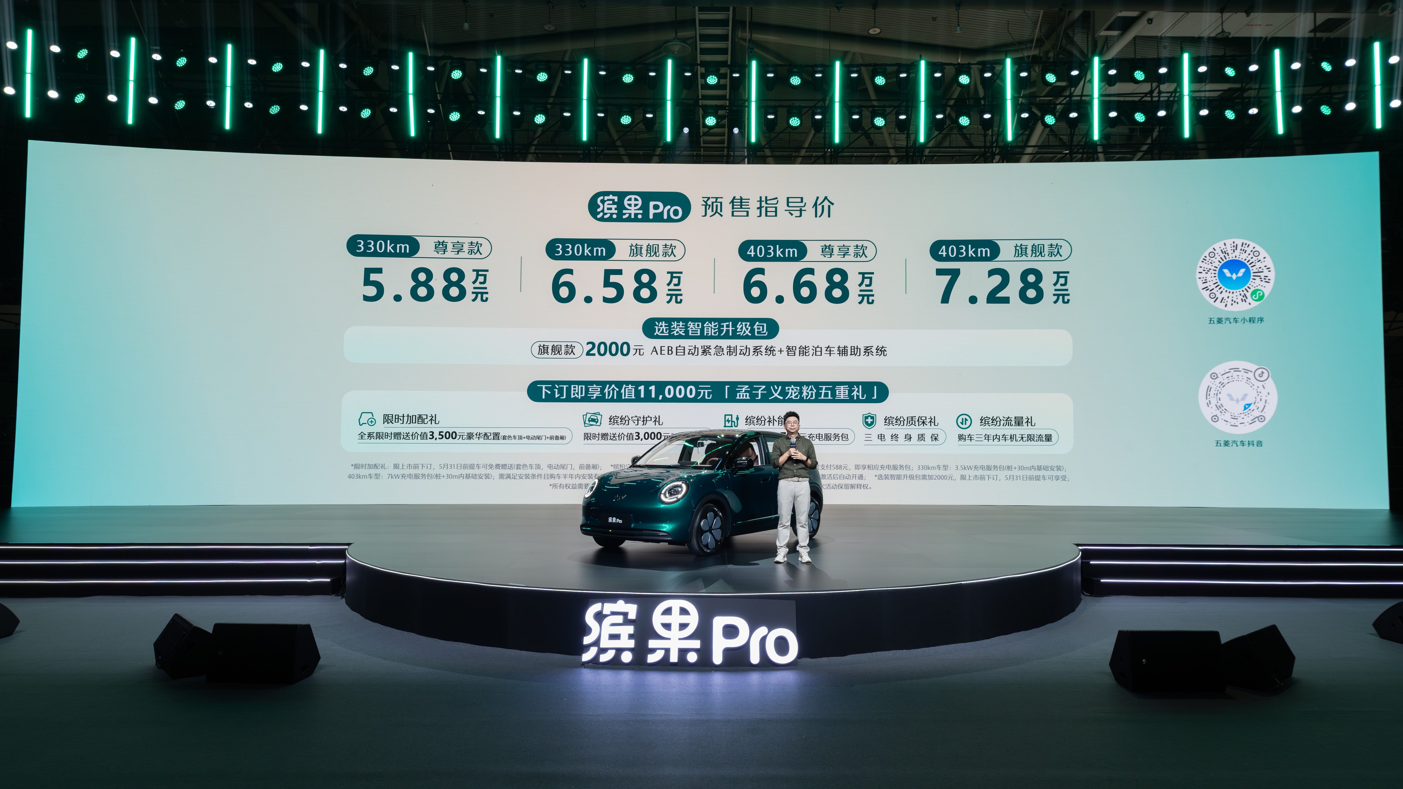 此次缤果 Pro 共推出330km 尊享款、330km 旗舰款、403km 尊享款、403km 旗舰款四款配置,预售价格覆盖 5.88 万 - 7.28 万元,这个区间刚好卡在主流代步车的核心预算带,不管是预算 6 万左右的入门需求,还是追求长续航、高配置的进阶选择,都能找到适配的车型。更让人意外的是,官方同步推出了至高价值 11000 元的 “孟子义宠粉五重礼”,限时赠送套色车顶、电动尾门、前备厢等实用配置,折算下来,实际入手的性价比还要再上一个台阶。
