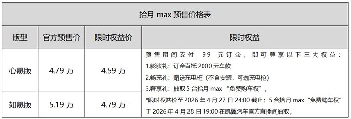 预售期间支付 99 元订金,即可尊享以下三大权益:1.膨胀礼:订金直抵2000元车款2.畅充礼:赠送充电桩(不含安装,可选充电枪)3.奢享礼:抽取5台拾月max “免费购车权”。*限时权益价至2026年4月27日 24:00截止;5台拾月max“免费购车权”于2026年4月28日19:00在凯翼汽车官方直播间抽取。